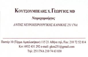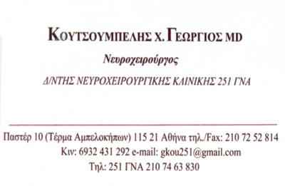 O Νευροχειρουργός Γεώργιος Κουτσουμπέλης είναι Διευθυντής της Νευροχειρουργικήςκλινικης του 251 Γενικού Νοσοκομείου Πολεμικής Αεροπορίας ,είναι εξειδικευμένοςστο Ηνωμένο Βασίλειο (UK), μετεκπαιδεύτηκε στην Πανεπιστημιάκη κλινικήΝευροχειρουργικής και Ορθοπαιδικής στην Köln Γερμανίας ένω έχει παρακολουθήσειειδικά εκπαιδευτικά σεμινάρια σε Γερμανία, Αυστρία και Ελβετίαπάνω στην Ενδοσκοπική χειρουργική της Σπονδυλικής Στήλης.